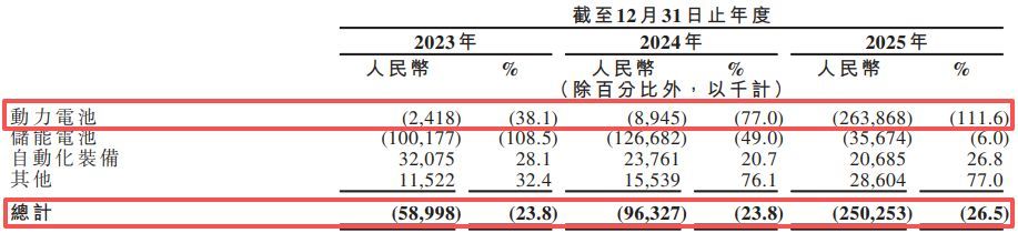 在各项业务中,被公司视为未来核心战略重点的动力电池产品,其盈利指标的下滑尤为显著。2023年,动力电池业务的毛利率为-38.1%,到了2024年下降至-77%,而在交付量大幅提升的2025年,该业务毛利率进一步降至-111.6%。动力电池业务在2025年贡献了2.37亿元的收入,但同时带来了2.64亿元的直接毛损,成为影响公司整体利润表现的主要业务。