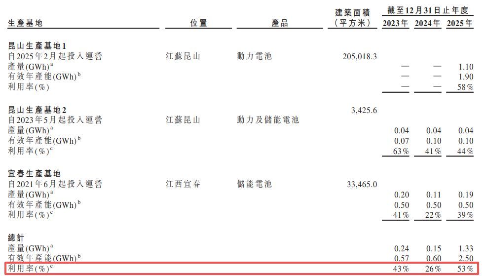 招股书还显示,2025年,清陶能源的总有效年产能达到2.50GWh,但实际产量仅为1.33GWh,产能利用率仅53%。大量生产线处于商业化前期、产能爬坡或是频繁的试产切换阶段,导致有限的交付量必须分摊较高的固定及半固定成本。叠加早期操作变化带来的材料损耗和良率波动,单位制造成本较高,与下降的终端售价共同导致动力电池业务毛利率为-111.6%。