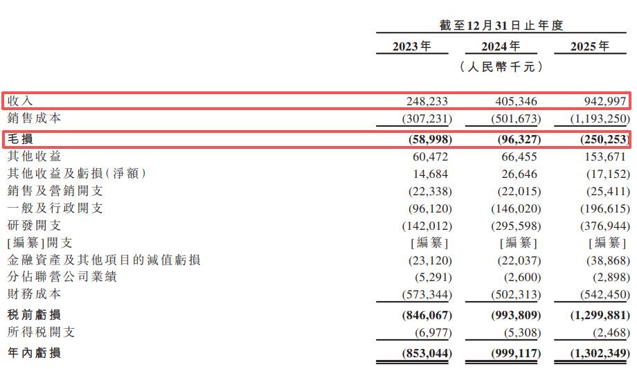 清陶能源的整体盈利能力在报告期未见改善,且随着营收规模的扩大而承压。招股书数据显示,报告期内,公司的收入虽然从2.48亿元增长至9.43亿元,但同期产生的毛损却从5900万元攀升至2.5亿元。整体毛利率不仅连续三年为负,更在2025年进一步下探至-26.5%。