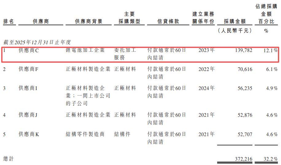 此外,清陶能源报告期内还存在客户与供应商重合现象——公司的部分主要客户同时也是其主要供应商。以2025年为例,公司最大的供应商C是一家锂电池加工企业,当年的采购金额约为1.4亿元,占总采购金额的12.1%,而该实体同时也是公司的客户。此外,2023年的第一大客户在当年贡献了7542万元的收入,该客户同样也是公司2024年的前五大供应商之一。
