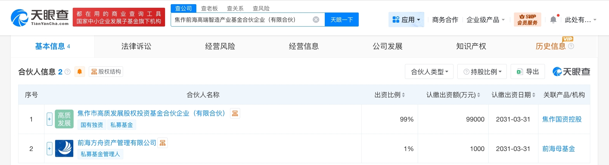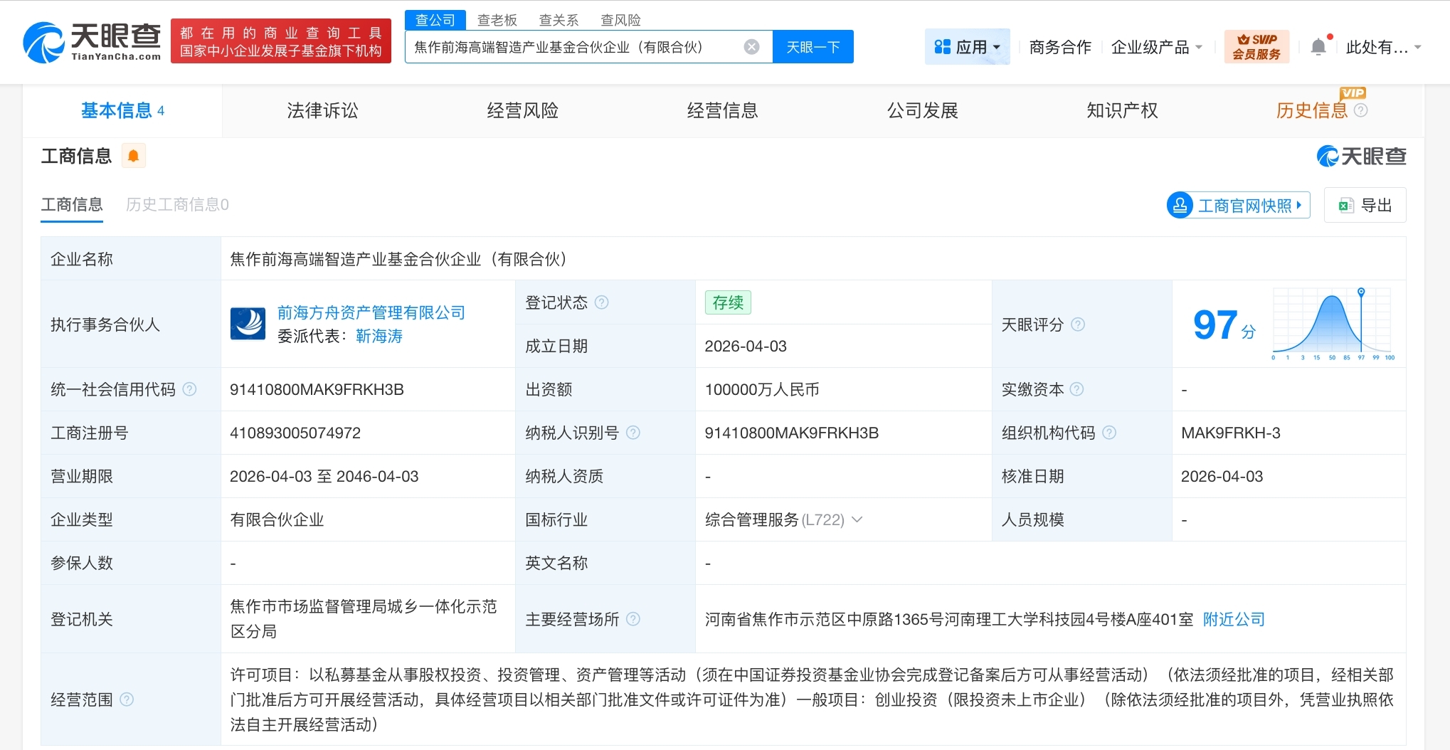 每经AI快讯,天眼查工商信息显示,近日,焦作前海高端智造产业基金合伙企业(有限合伙)成立,执行事务合伙人为前海方舟资产管理有限公司,出资额10亿元人民币,经营范围包括以私募基金从事股权投资、投资管理、资产管理等活动,创业投资。合伙人信息显示,该基金由焦作市高质发展股权投资基金合伙企业(有限合伙)、前海方舟资产管理有限公司共同出资。